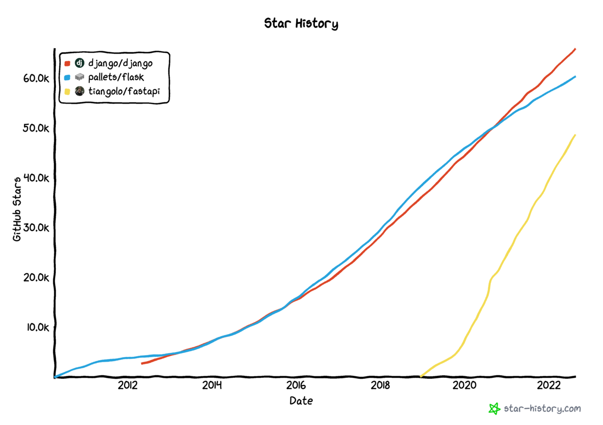Pythonフレームワークのgithubスター数はDjango, Flaskに次ぐ第3位!初版リリース2018年にして、上位を追い越しそうな勢いです!