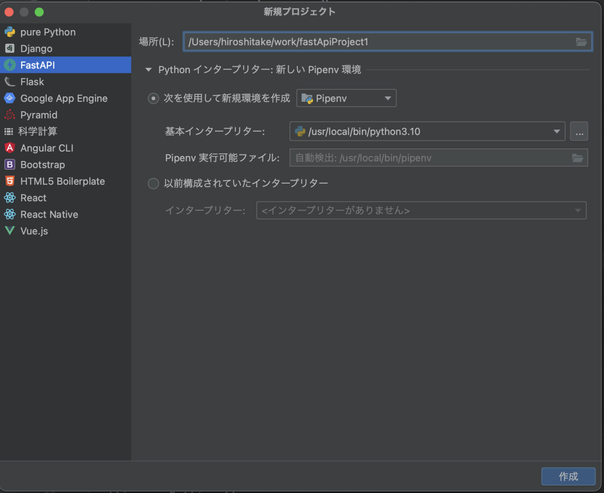 PyCharmのプロジェクト作成で、作成するディレクトリを選んでFastAPIを選択します。