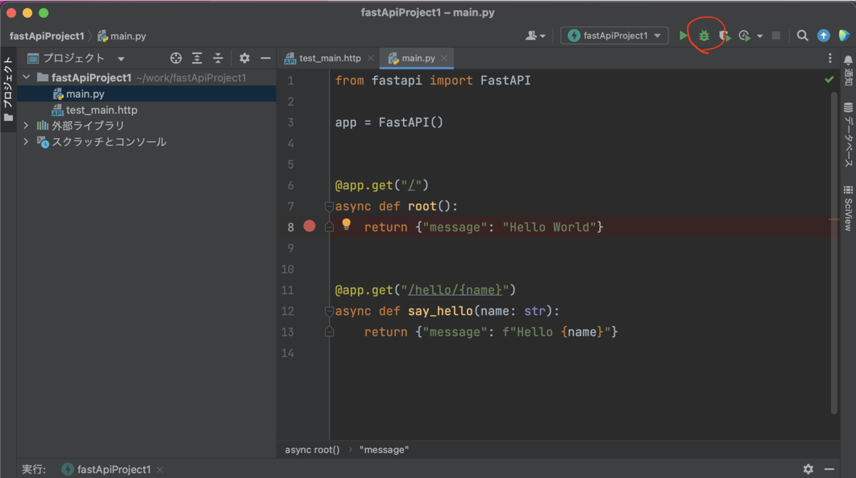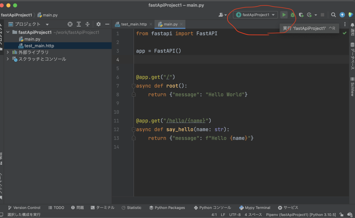 いったん、右上のfastApiProject1(プロジェクト名)が出ている状態で再生ボタンを押しましょう。