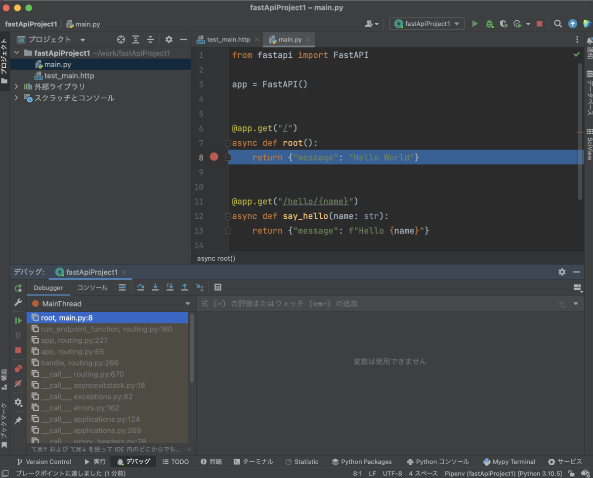 main.pyにはAPIのパスとhttp methodを定義する @app.get("/") という表記がありますね。