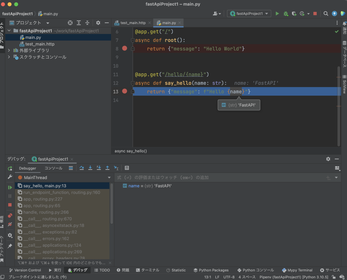 URLのパスであたえたFastAPIという文字列がnameという変数に入り、say_hello(name: str)の引数nameで受け取れたことが確認できたと思います。