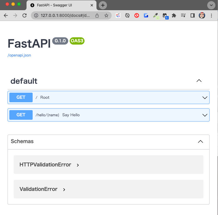 このように@app.get で定義されている2つのエンドポイントが出ていますね。