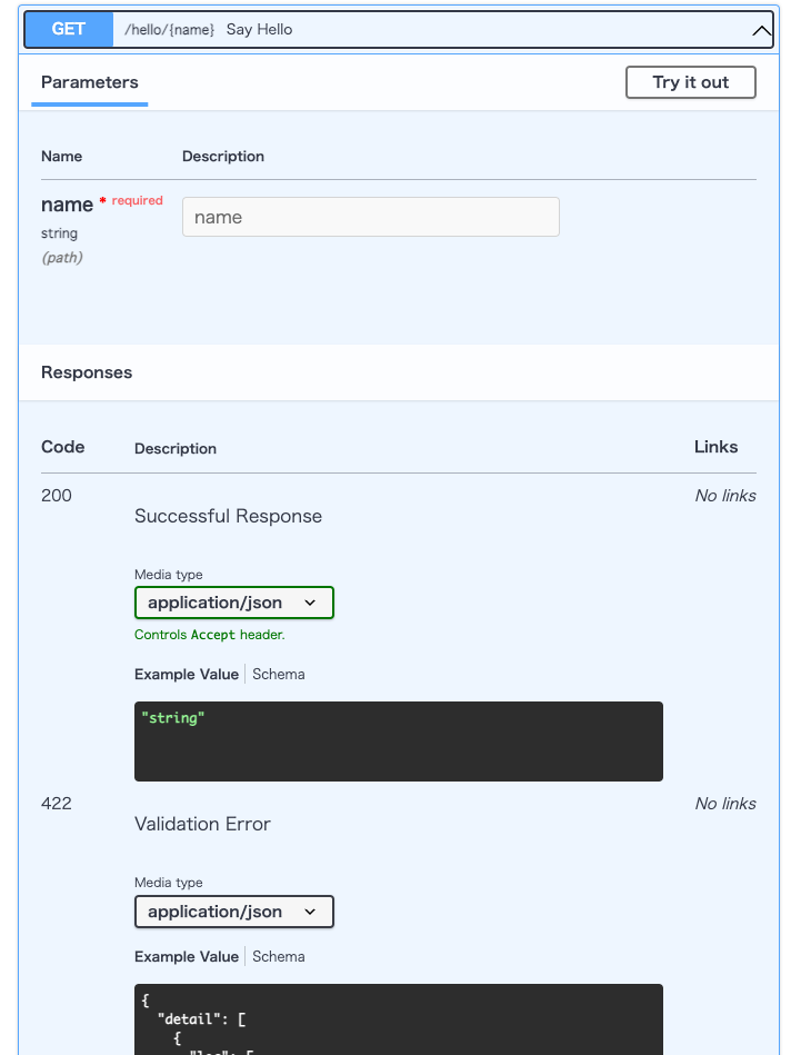 このようにパラメータやレスポンスの仕様について確認することができます。