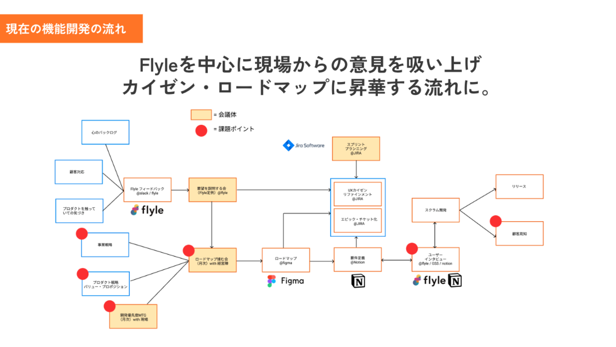 そういった機能開発の状況から1年半経った今は、概ね上記のような流れで開発を進めています。左から右に流れていくような形ですが、スライド右上に「心のバックログ」なる「実はこう改善したい」という思いや、自身がプロダクトを利用していての気付き、日々お客様とやりとりする中で生まれてくる改善要望などがあり、これらを「Flyle」に収集します。
