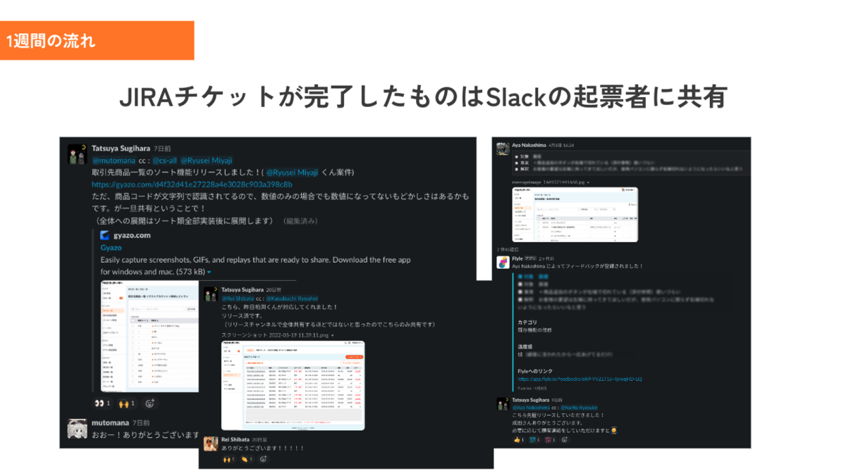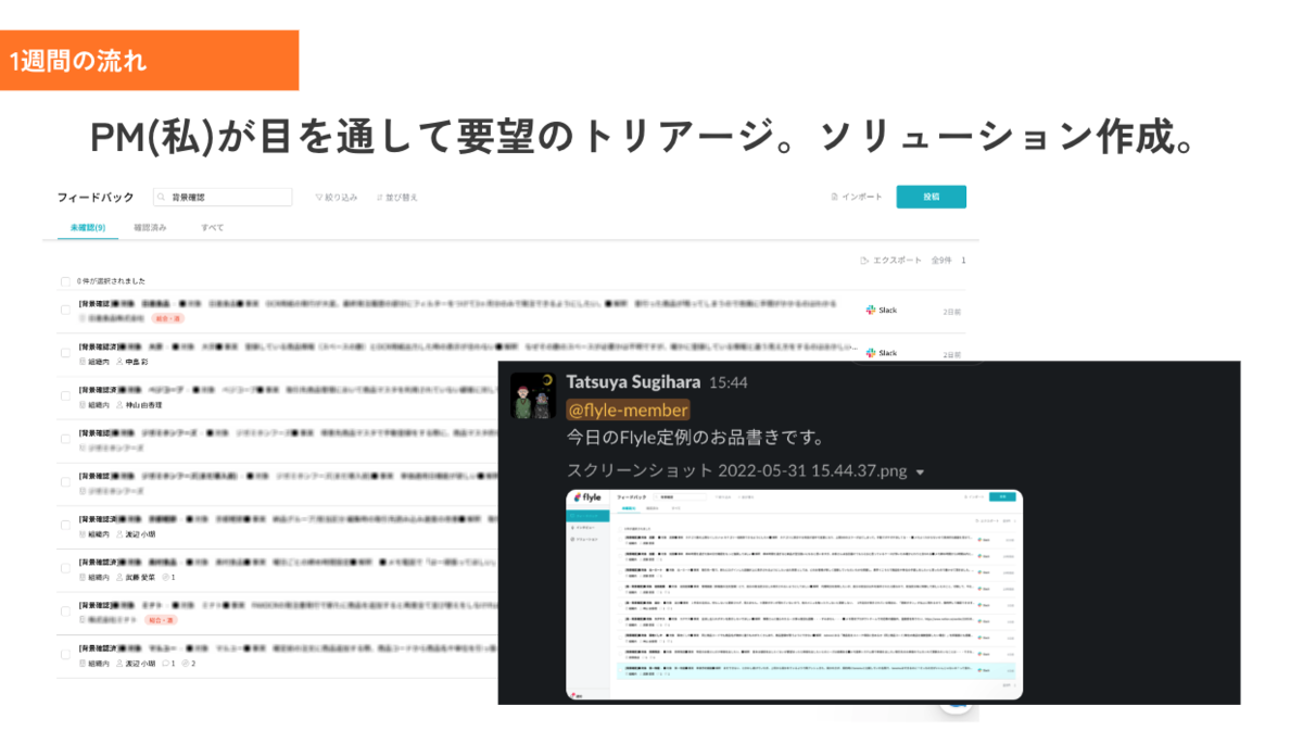 具体的な1週間の流れをチラ見せすると、上記のような形でいろんな職種・役割の人がSlackの指定チャンネルに要望を書き込みます。