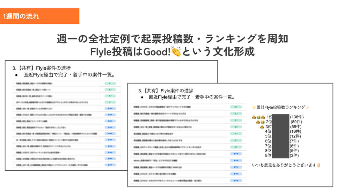 投稿数のランキングと頂いた要望の中でその週時点での着手中とリリース済のチケットの一覧を全社に共有するようにしています。