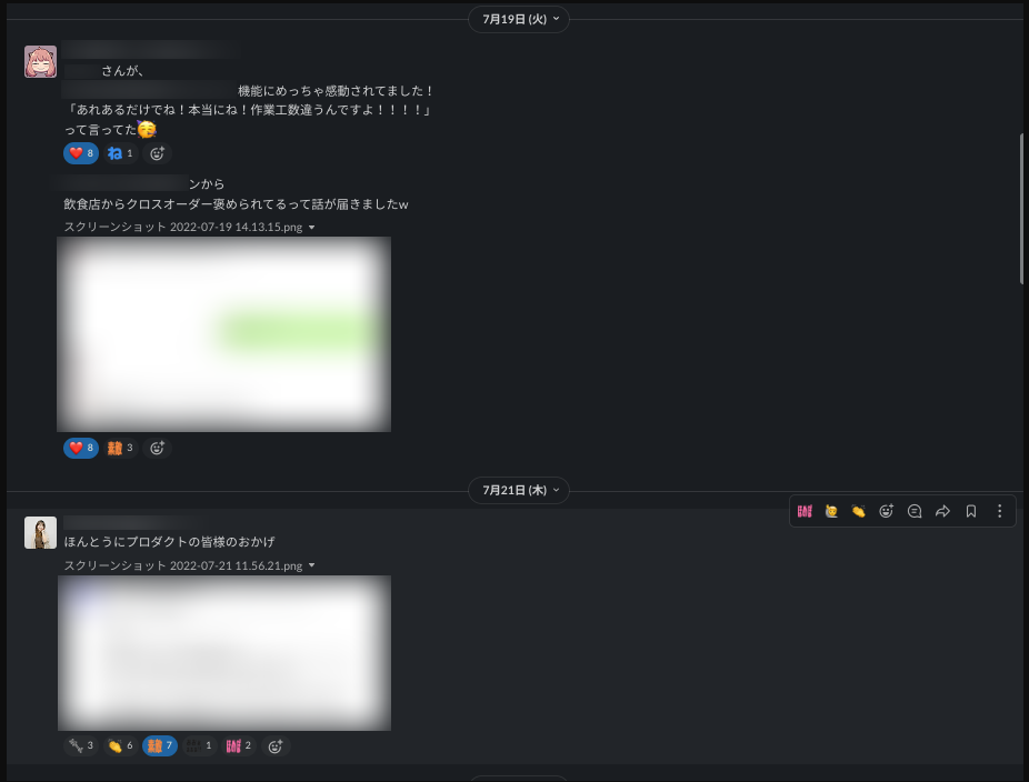 - SlackにはUserVoiceというチャンネルがあり、セールスチームやカスタマーサクセスチームからお客様の声が日々届きます。喜びの声を目にしながら働けるのは本当に楽しい瞬間です