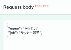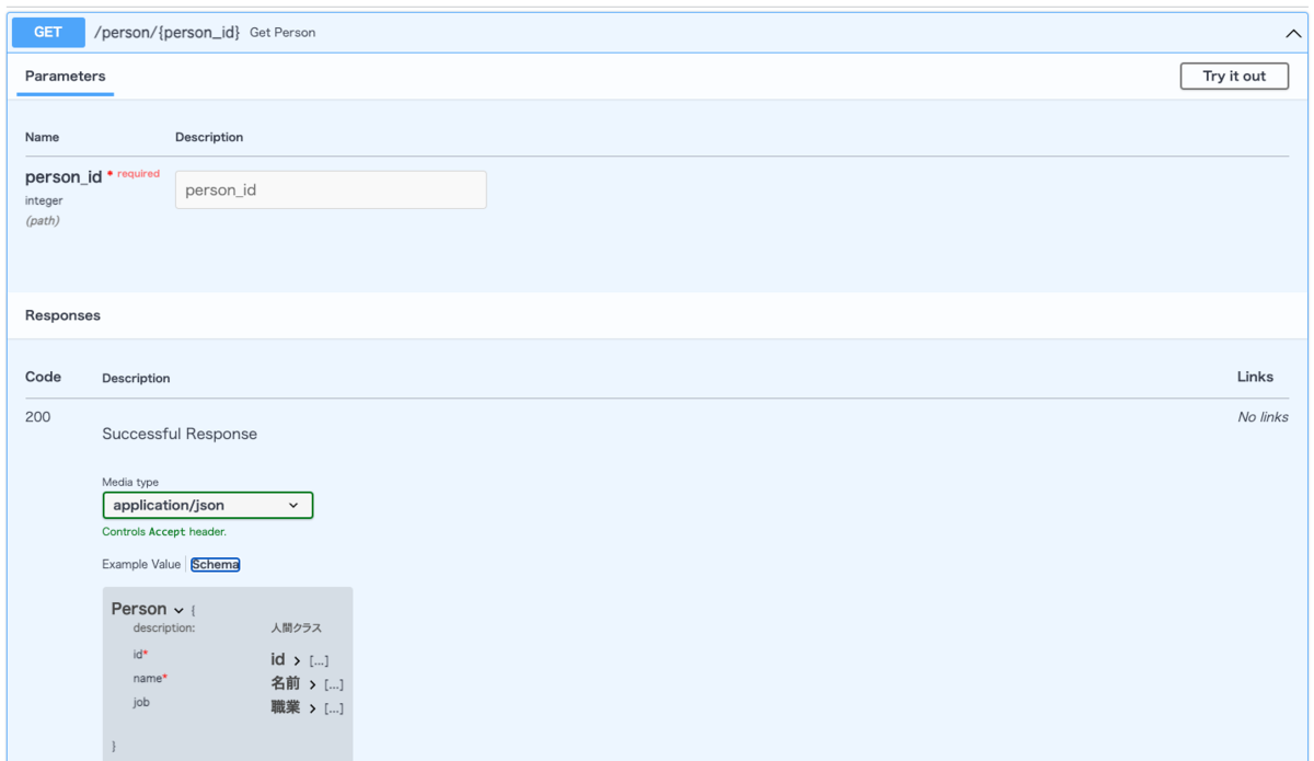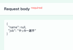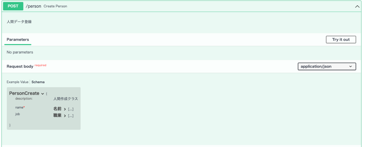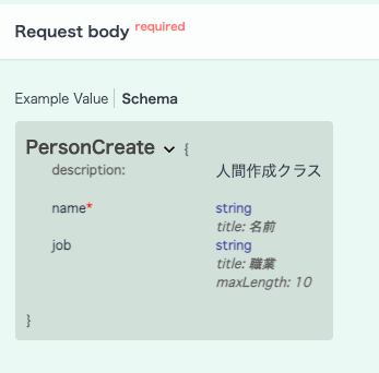 POST /person が作成されました。Request bodyの Schemaを見ると、赤の*がnameについていて、jobにはついていません。