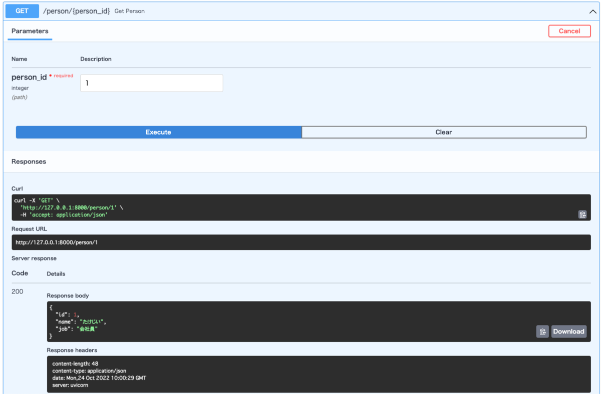 発番したidをつかって先ほどGET /person/{person_id} で使っていたPersonインスタンスの形で返すようにしています。