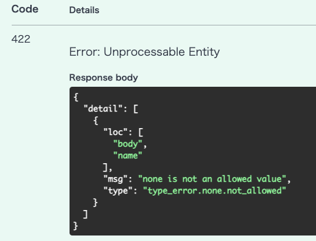 { "detail": [ { "loc": [ "body", "name" ], "msg": "none is not an allowed value", "type": "type_error.none.not_allowed" } ] }