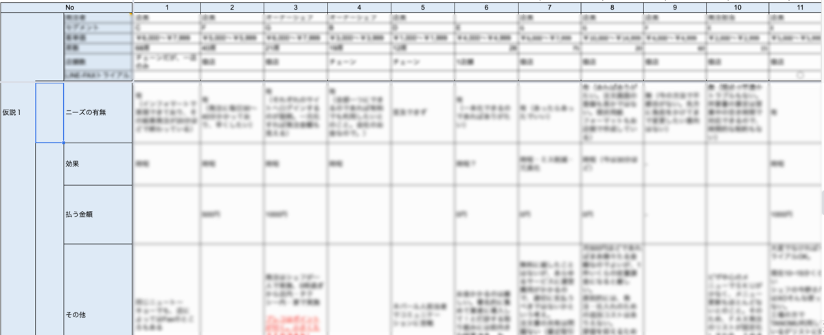 想定ユーザーをセグメントわけしたり、調査結果を横比較できるようにフォーマットにまとめたり、(既存のサービス利用ユーザーへのインタビューが多いので)現状の利用実態や過去の問い合わせ状況をまとめたり...こういった内容を手を抜かず、ただ効率的に実施するのが重要だなと思っています。