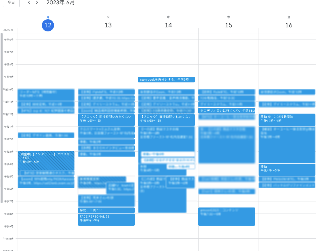 自分のタスクの進め方が、MTG駆動(MTG設定してそれまでにタスクを進めようとするやり方)なので比較的MTGが多めです。(これでも減ったほう & この週はロングの現場見学とPJTのロングMTGあるので少し特殊な週ではありますが)