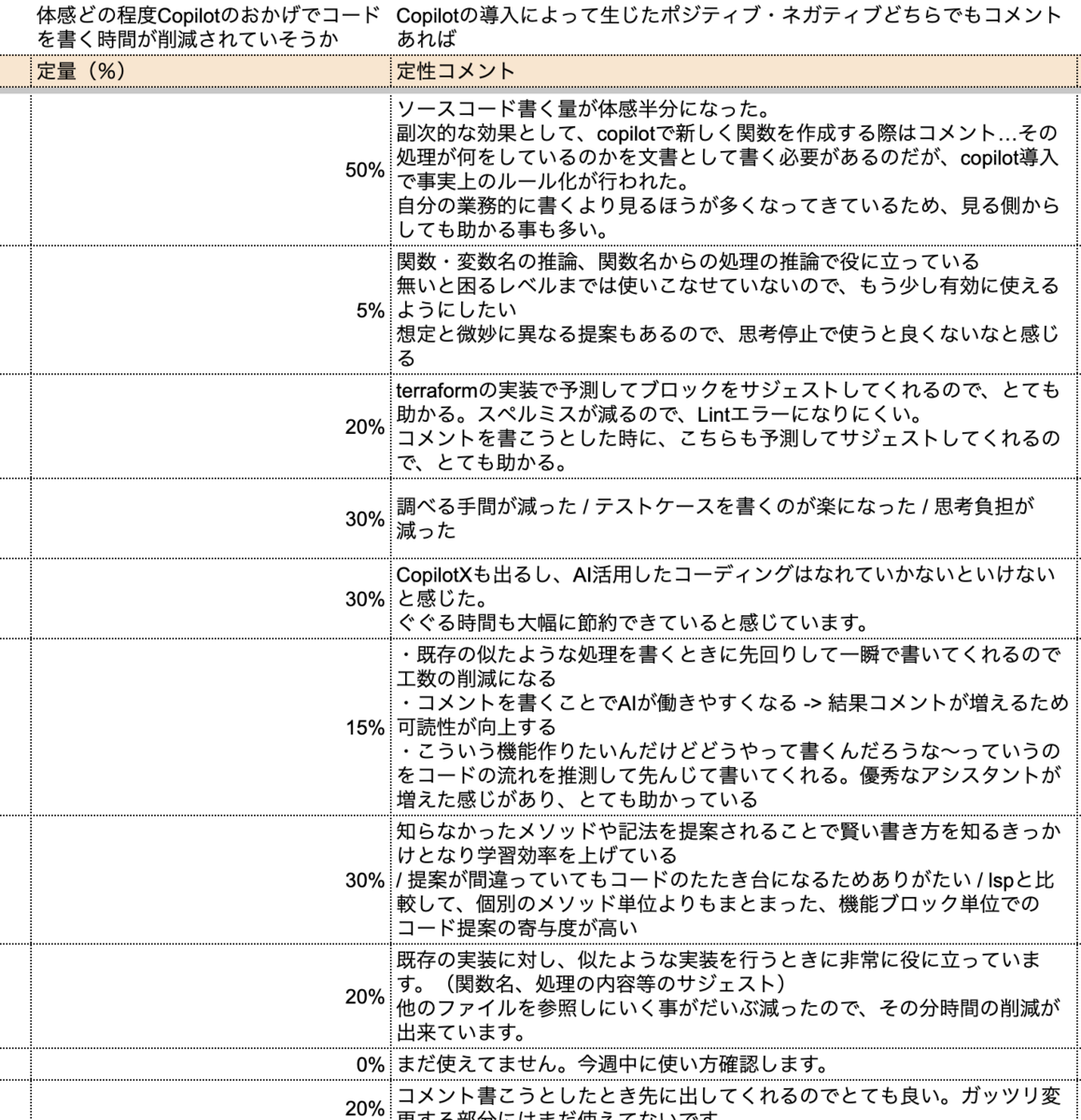 実際にエンジニアメンバーにCopilotを使ってどれくらいコードを書く量が削減できたかもアンケートを取ってみました。