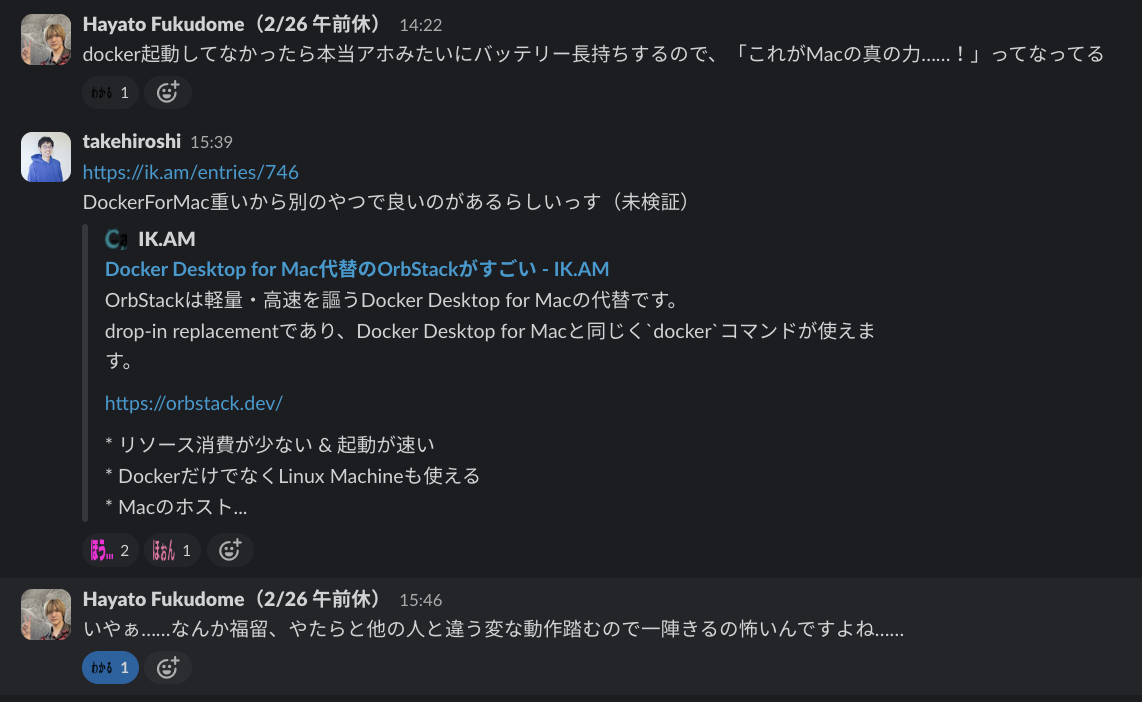 そうした中、TwitterでOrbStackというDocker for Macより軽量なDockerツールがあるということを知り、早速同僚に勧めてみました。