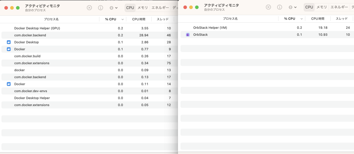このOrbStackにより、システムリソースの消費を大幅に削減し、開発者のマシン上での動作が格段に軽快になりました。特に、複数のコンテナを同時に動かす際のパフォーマンス改善が顕著で、開発環境の快適性が大きく向上しました。