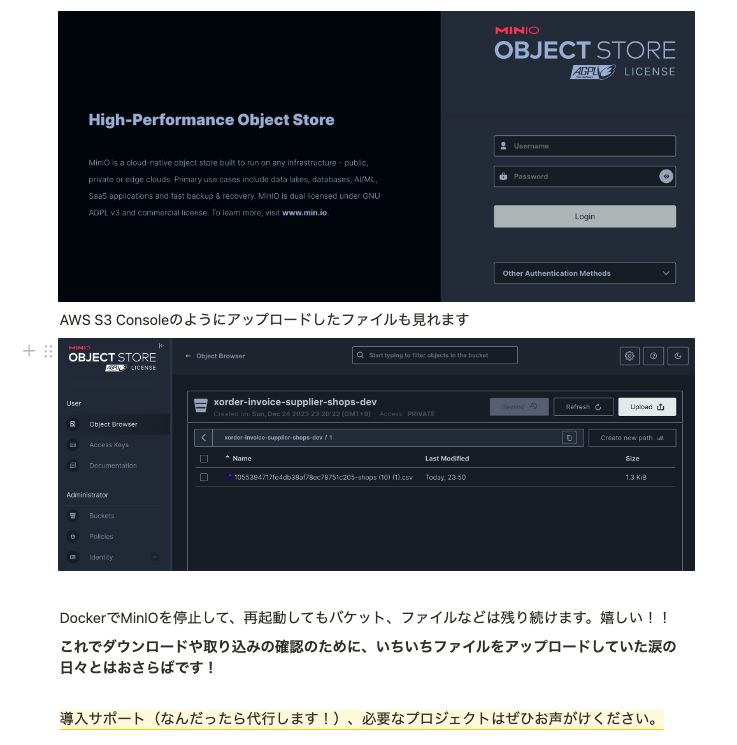 AWS S3の機能をローカルでエミュレートするのにlocalstack(https://www.localstack.cloud/)を使っていました。ですが去年、localstackが有料化し、無料版のままだとアップロードしたファイルは永続化されなくなってしまいました。(localstackを停止するとファイルやバケットは全て消えてしまう) CSVファイルをアップロードして、取り込み処理を行う機能が多い弊社サービスにとっては、開発やテストがしにくくなりかなりの痛手でした。 そこで目をつけたのが最近目にすることが多くなっていたMinIOです。 MinIOは、特にファイルストレージのテスト環境においてその価値を発揮しました。localstackの代替として導入後、ファイルの永続化に関する課題を解決し、開発とテストの効率が向上しました。この変更により、データの持続性を必要とするテストケースが容易に実行可能となりました。